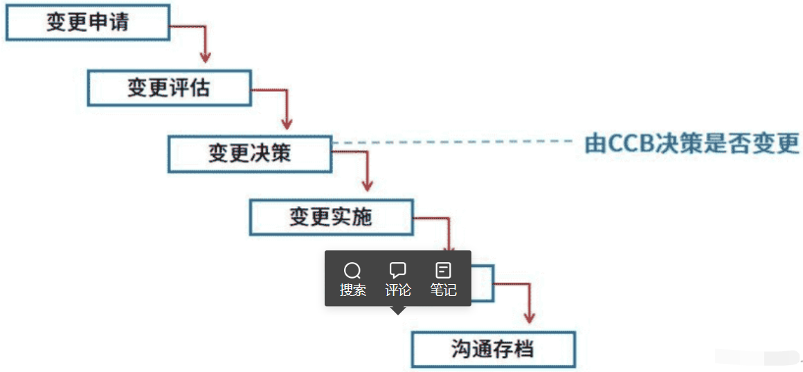 Board)。CCB由项目干系人中有代表性的人员组成,人数没有限制,一个人也可以。CCB有能力在管理上做出承诺,对建议的配置项变更做出评价、审批及监督已批准变更的实施。CCB是决策机构,一般不参与具体的变更执行工作。