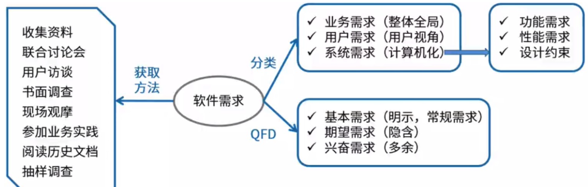 软件需求是指用户对系统在功能、行为、性能、设计约束等方面的期望。