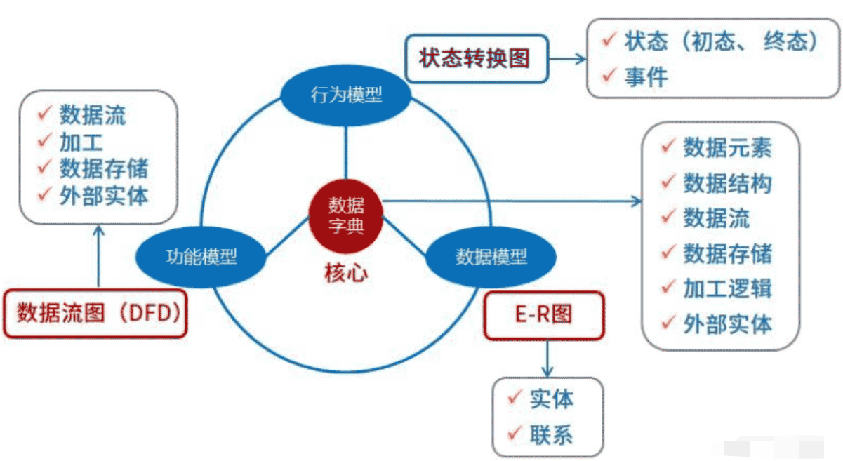 结构化分析方法SA的核心是数据字典。围绕这个核心有三个层次的模型,分别是数据模型,功能模型,行为模型(状态模型)。