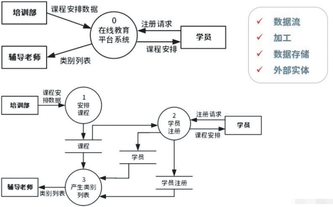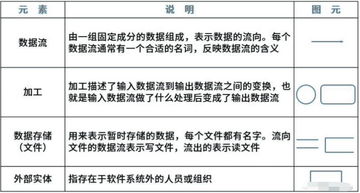 其中,DFD还会有“顶层DFD图”和“0层DFD图”。如下图,有如下几种“图元”描述: