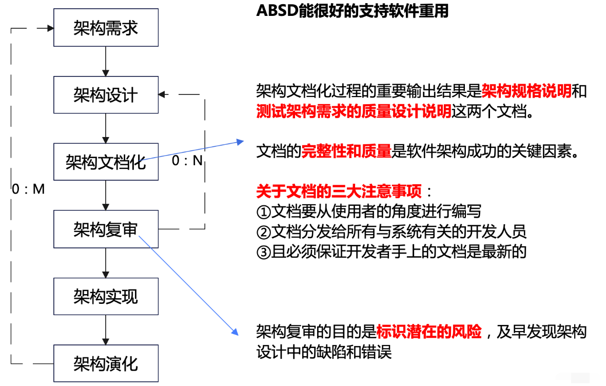 传统的软件开发过程是问题定义,需求分析,软件设计,实现,测试。ABSD把整个软件过程分成六个部分,架构需求,设计,文档化,复审,实现,演化六个步骤。
