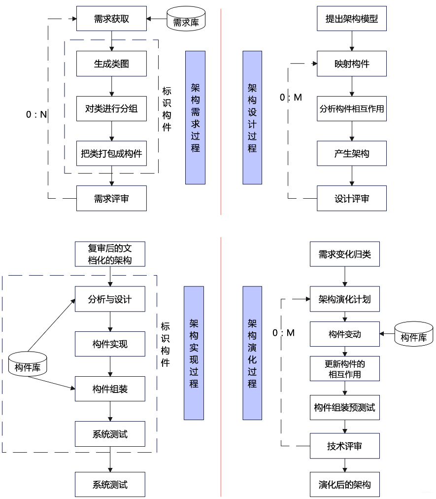 | 后开发阶段 | 主要围绕维护、演化、复用进行。 部署安装后(后开发阶段)的系统架构研究方向包括: 1)动态软件体系结构 2)体系结构恢复与重建 |
