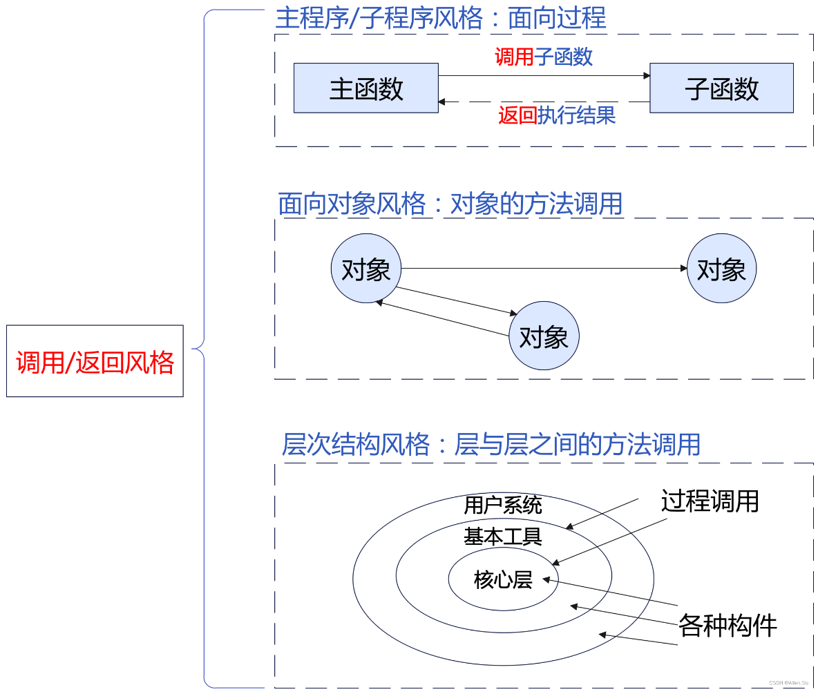 | 调用/返回风格 | 程序/子程序、面向对象、层次结构 |