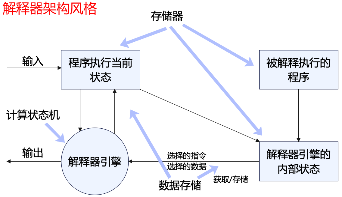 解释器通常包括一个完成解释工作的解释引擎、一个包含将被解释的代码的存储区、一个记录解释引擎当前工作状态的数据结构,以及一个记录源代码被解释执行的进度的数据结构。具有解释器风格的软件中含有一个虚拟机,可以仿真硬件的执行过程和一些关键应用,其缺点是执行效率比较低。