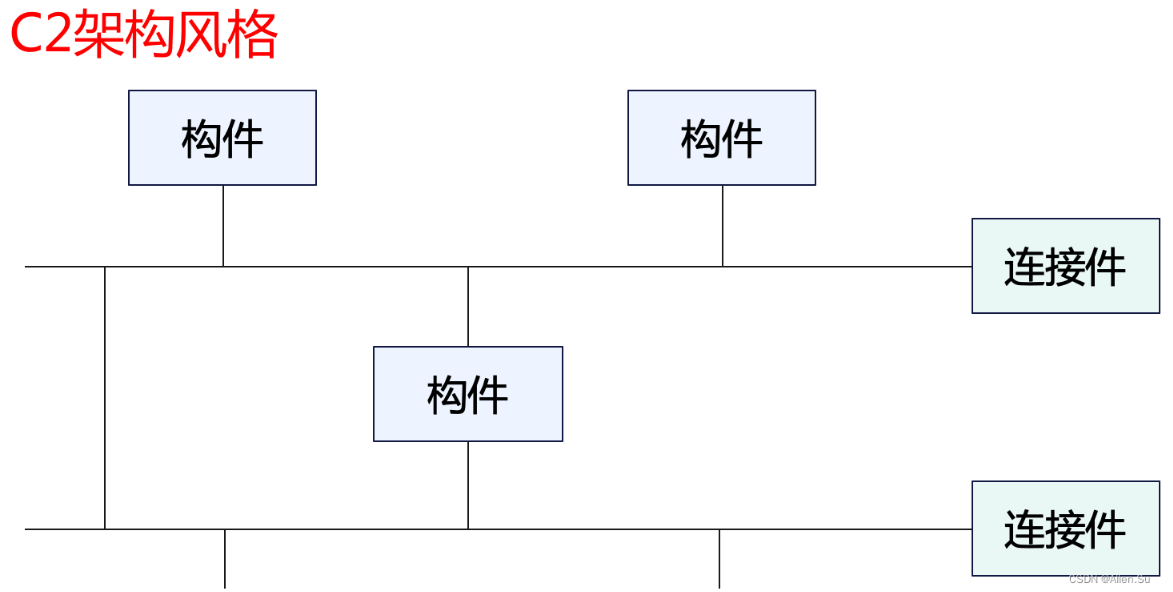 C2是一种基于构件和消息的架构风格,可用于创建灵活的,可伸缩的软件系统。可以将架构看作是按照一定规则由连接件如消息路由设备连接的许多构件组成的层次网络系统中的构件和连接件都有一个“顶部”和“底部”;一个构件的“顶部”或“底部”可以连接到一个连接件的“底部”或“顶部”;对于一个连接件,和其相连的构件或连接件的数量没有限制,但是构件和构件之间不能直接相连。