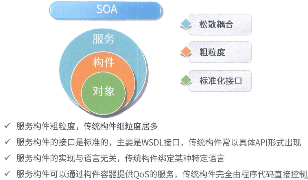 - 服务之间的松耦合性 。服务使用者看到的是服务的接口,其位置、实现技术和当前状态等对使用者是不可见的,服务私有数据对服务使用者是不可见的。