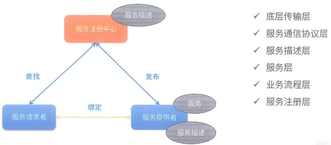 (3) 服务绑定 :服务的消费者利用检索到的服务合同来开发代码,开发的代码与注册的服务绑定、调用注册的服务以及它们实现互动。