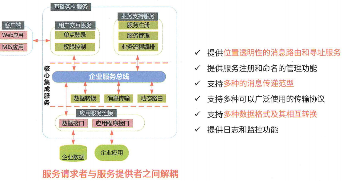 企业服务总线模式提供一种标准的软件底层架构,各种程序组件能够以服务单元的方式“插入”到该平台上运行,并且组件之间能够以标准的消息通信方式来进行交互。其核心功能如下: