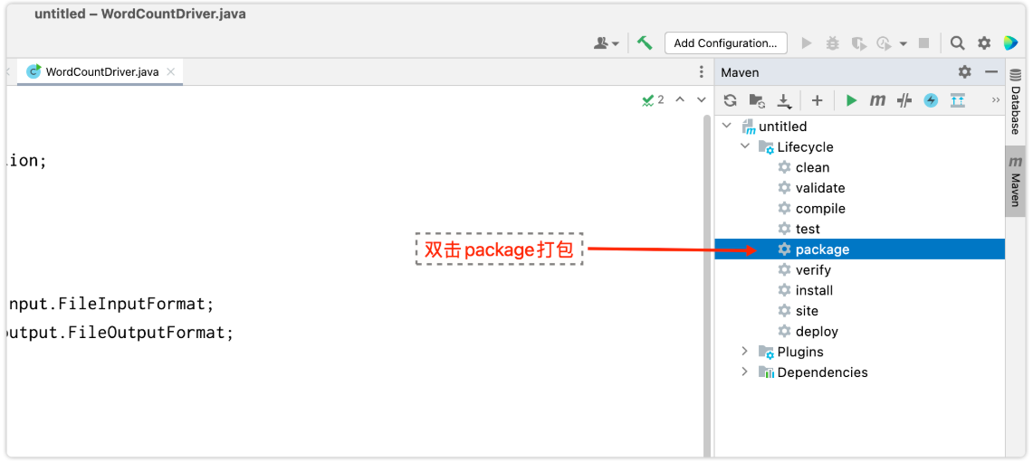 7.6 定义Driver类 1 2 3 4 5 6 7 8 9 10 11 12 13 14 15 16 17 18 19 20 21 22 23 24 25 26 27 28 29 30 31 32 33 34 35 36 37 38 39 40 41 42 43 44 45 46 47 48 package wc;import org.apache.hadoop.conf.Configuration;import org.apache.hadoop.fs.Path;import org.apache.hadoop.io.IntWritable;import org.apache.hadoop.io.Text;import org.apache.hadoop.mapreduce.Job;import org.apache.hadoop.mapreduce.lib.input.FileInputFormat;import org.apache.hadoop.mapreduce.lib.output.FileOutputFormat;import java.io.IOException;public class WordCountDriver { public static void main (String[] args) throws IOException, InterruptedException, ClassNotFoundException { Configuration conf = new Configuration (); conf.set("fs.defaultFS" , "hdfs://192.168.10.101:9820" ); Job job = Job.getInstance(conf); job.setMapperClass(WordCountMapper.class); job.setReducerClass(WordCountReducer.class); job.setJarByClass(WordCountDriver.class); job.setOutputKeyClass(Text.class); job.setOutputValueClass(IntWritable.class); FileInputFormat.setInputPaths(job, new Path (args[0 ])); FileOutputFormat.setOutputPath(job, new Path (args[1 ])); System.exit(job.waitForCompletion(true ) ? 0 : -1 ); } }