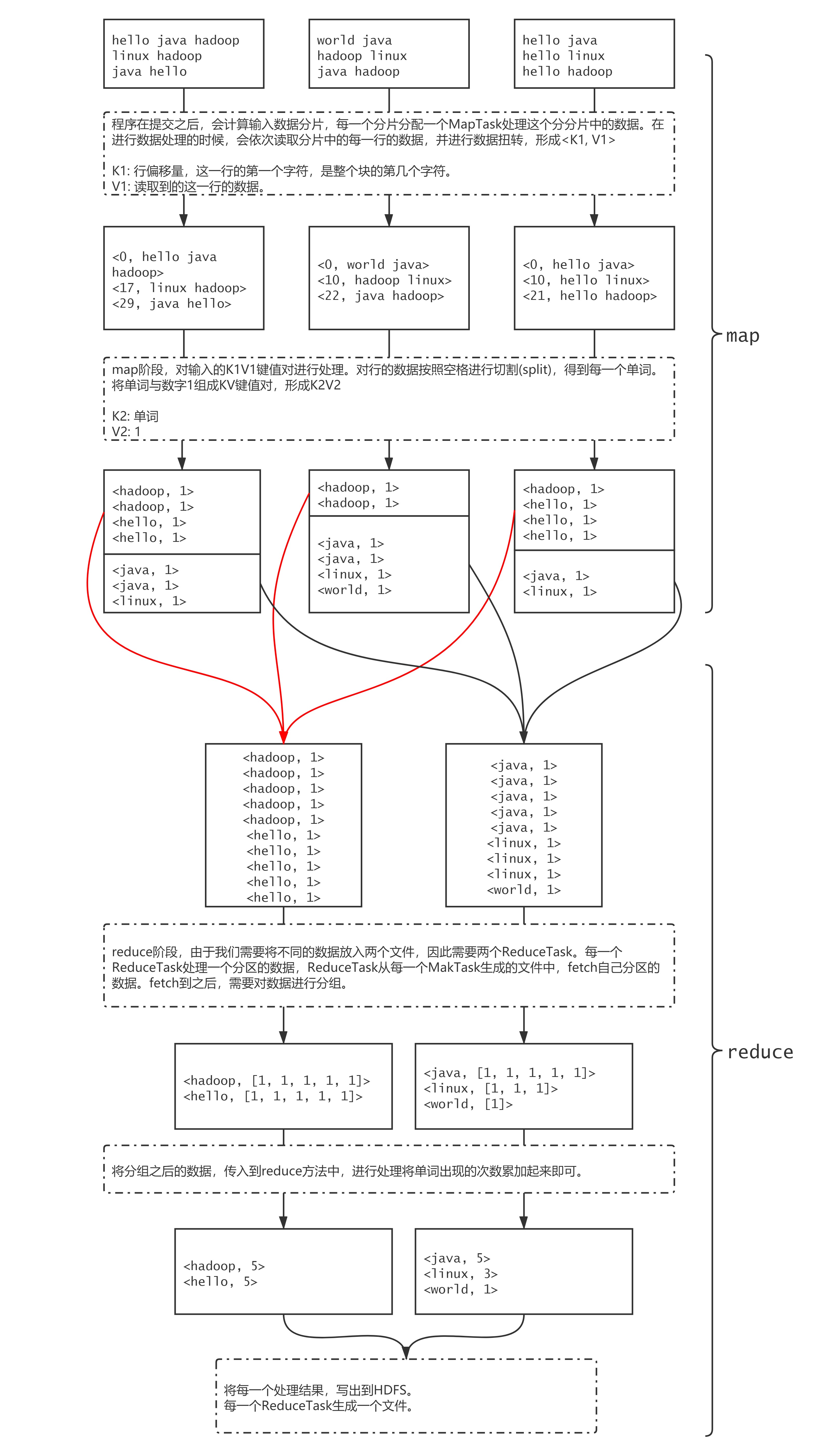 该阶段的编程模型中有一个reduce函数需要开发人员重写,reduce函数的输入也是一个<key,value>对,reduce函数的输出也是一个<key,value>对。这里要强调的是,reduce的输入其实就是map的输出,只不过map的输出经过shuffle技术后变成了<key,List<Value>>而已。参考下图: