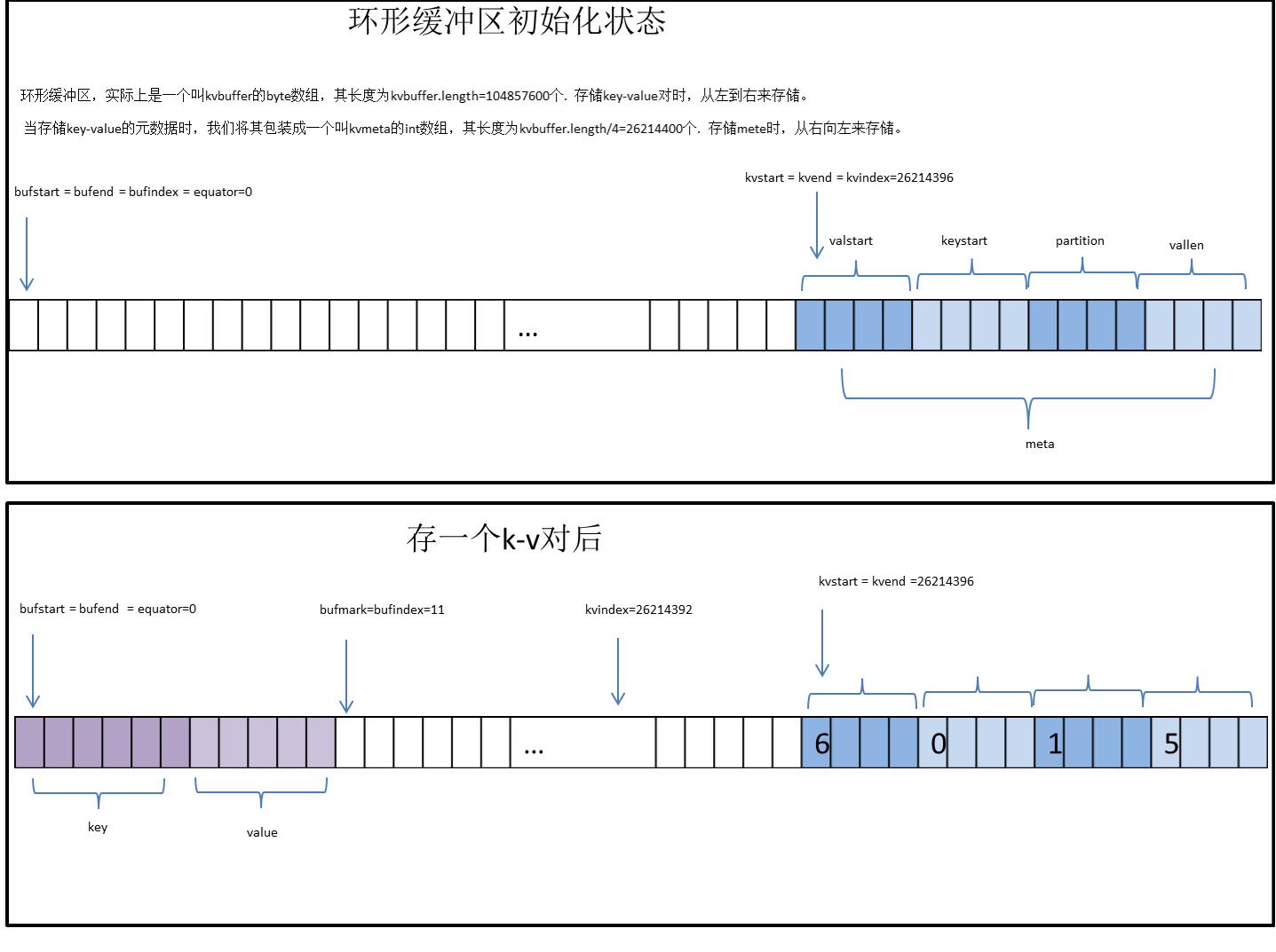 环形缓冲区:其实是一个字节数组kvbuffer. 有一个sequator标记,kv原始数据从左向右填充(顺时针),