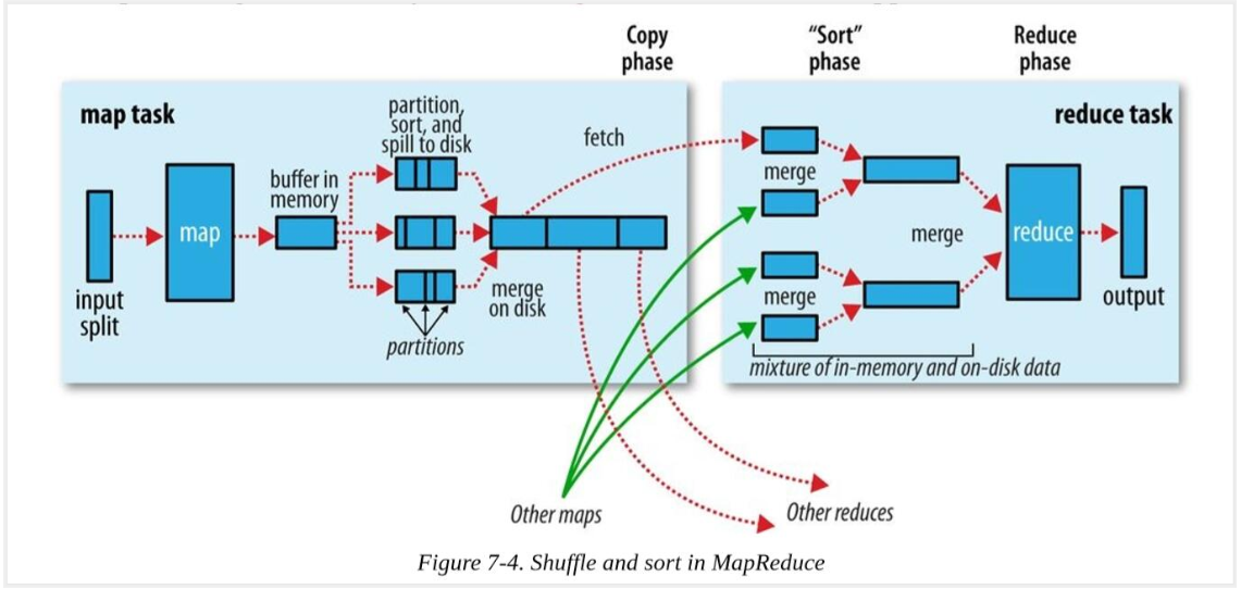 如果map输出相当小,会被复制到reduce任务JVM的内存(缓冲区大小由mapreduce.reduce.shuffle.input. buffer.percent 属性控制,指定用于此用途的堆空间的百分比),否则,map输出被复制到磁盘。一旦内存缓冲区达到阈值大小(由 mapreduce.reduce.shuffle.merge.percent 决定)或达到 map 输出阈值(由 mapreduce. reduce. merge. inmem .threshold 控制),则合并后溢出写到磁盘中。如果指定combiner,则在合并期间运行它以降低写入硬盘的数据量。