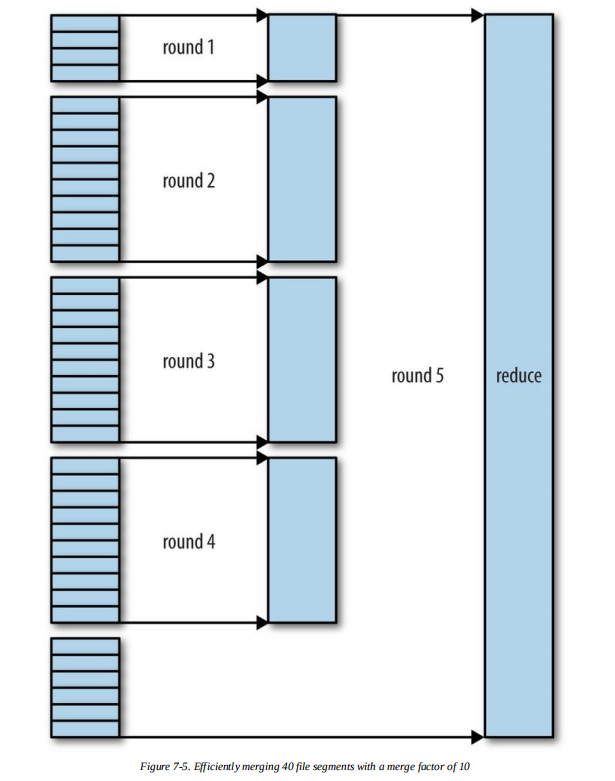 在最后阶段,即reduce阶段,直接把数据输入reduce函数,从而省略了一次磁盘往返行程,并没有将这5个文件合并成一个已排序的文件作为最后一趟。最后的合并可以来自内存和磁盘片段。