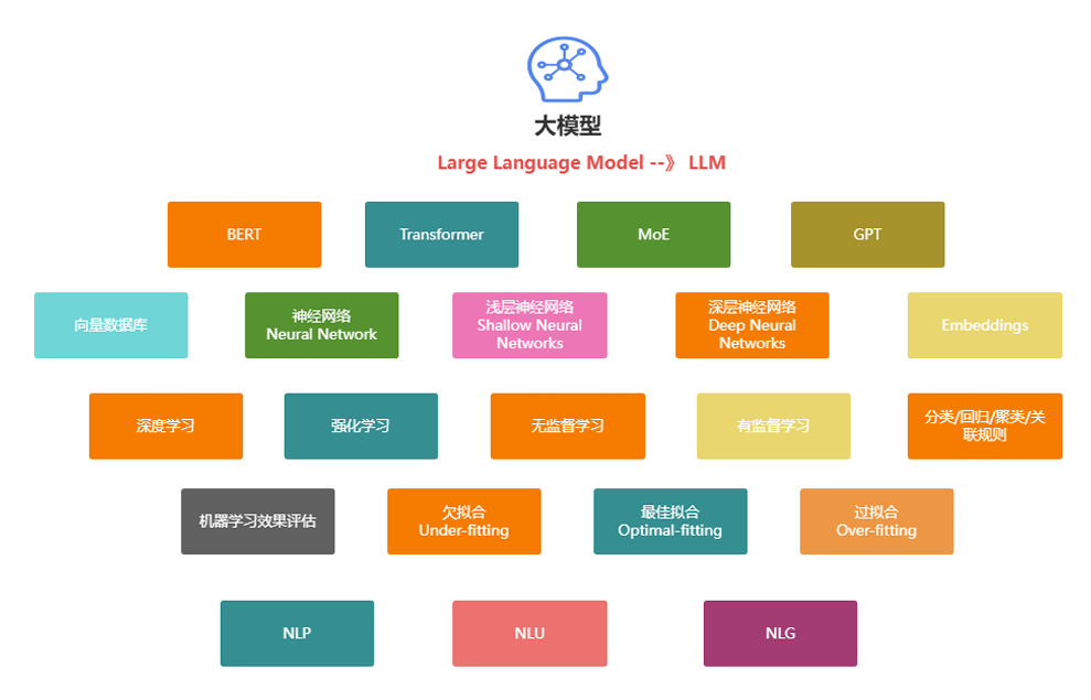 大模型,全称「大语言模型」,英文「Large Language Model」,缩写 「LLM」。是一种基于机器学习和自然语言处理技术的模型,它通过对大量的文本 数据进行训练,来学习服务人类语言理解和生成的能力。eg: 一个人从小学到高中毕 业这整个的学习阶段 — 大模型的训练 。