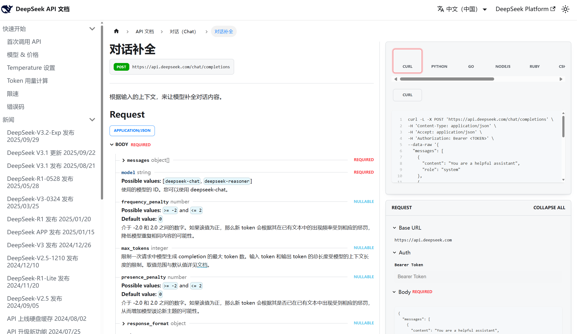 可以先以DeepSeek为例,进入DeepSeek官网,查看对应的API文档:https://api-docs.deepseek.com/zh-cn/api/create-chat-completion