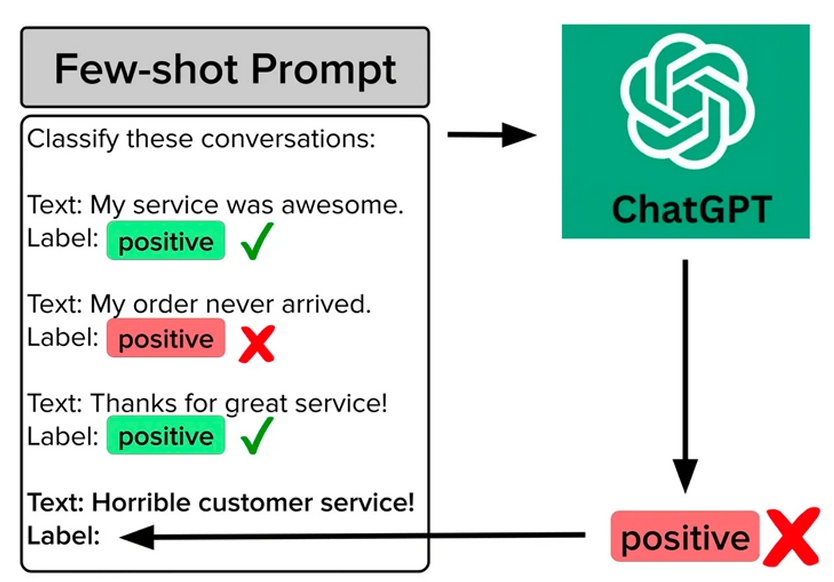 相较于零样本提示,少样本提示能够提供更具体的任务信息,帮助模型更好地理解任务要求,从而提高任务性能。而且与传统的有监督训练需要大量的标注数据不同,少 样本提示只需要少量的精心选择的示例即可,这对于数据获取困难或成本高昂的任务非常有利。 但是,少样本提示的效果对示例的选择非常敏感。示例的质量、多样性、代表性等因 素都会影响模型的学习效果。如果示例过于简单或复杂、缺乏代表性或者存在错误,都可能导致模型学习到错误的任务模式。除此之外,这样做的代价是消耗更多的token,并且当输入和输出文本较长时,可能会达到上下文长度限制。