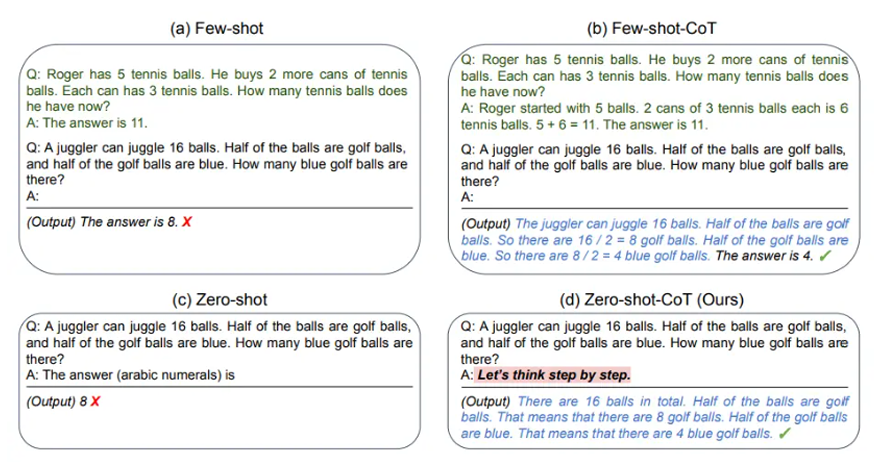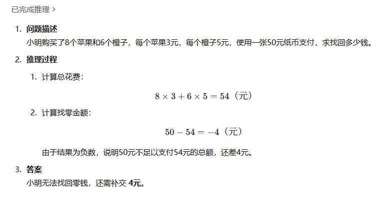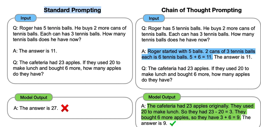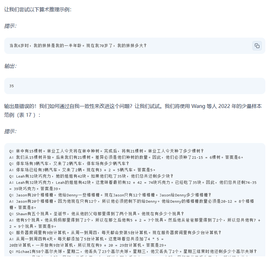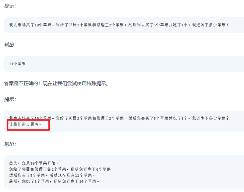 该方法通过提供中间推理步骤实现了复杂的推理能力,可以结合少样本提示方法引导 模型得到更加准确合理的输出,例如: