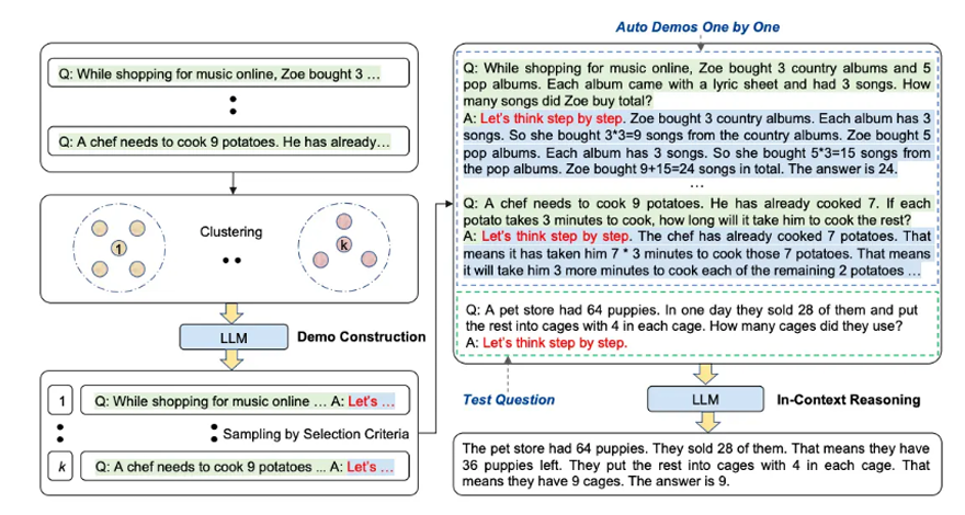 生活中的场景这么多,如果每个场景都写个思维链,岂不要累死,于是Amazon Science团队提出了自动思维链(Auto-CoT)的概念,它通过自动化流程构建“让我们一步步思考”的思维过程,以提高模型在复杂推理任务中的表现。