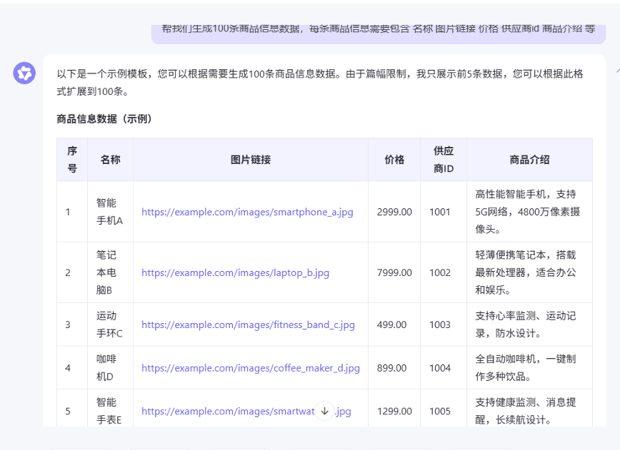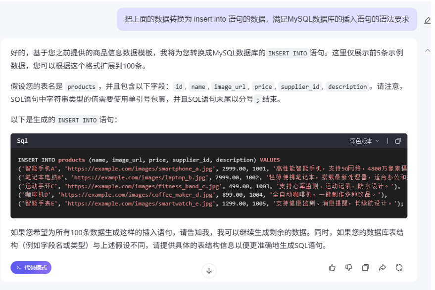 上面获取到的是json格式的数据。也可以让大模型把数据转换为 insert into 语句的数据,这样更加方便直接使用