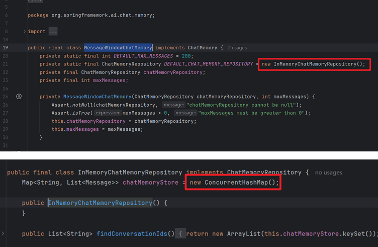 MessageWindowChatMemory默认的方式,使用 ConcurrentHashMap 在内存中存储消息。