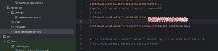 | @Autowired private JdbcTemplate jdbcTemplate; @Test void testMemery() { ChatMemoryRepository chatMemoryRepository = JdbcChatMemoryRepository.builder() .jdbcTemplate(jdbcTemplate) .dialect(new MysqlChatMemoryRepositoryDialect()) .build(); ChatMemory chatMemory = MessageWindowChatMemory.builder() .chatMemoryRepository(chatMemoryRepository) .maxMessages(10) .build(); ChatClient client = ChatClient.builder(model) .defaultAdvisors(new MessageChatMemoryAdvisor(chatMemory)) .build(); String response = client.prompt().user("北京暴雨,长沙大太阳,内蒙古天气很凉爽").call().content(); System.out.println(response); String content = client.prompt().user("前面的三个地方最近适合去哪里旅游呢?").call().content(); System.out.println(content); }