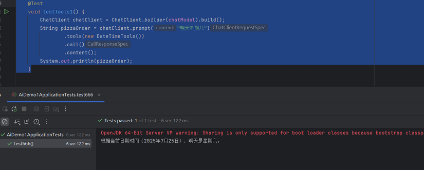 | @Test void testTools1(){ ChatClient chatClient = ChatClient.builder(chatModel).build(); String prizzaOrder = chatClient.prompt("明天星期几") .tools(new DateTimeTools()) .call() .content(); System.out.println(pizzaOrder); }
