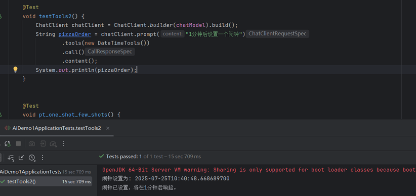 | @Test void testTools2() { ChatClient chatClient = ChatClient.builder(chatModel).build(); String pizzaOrder = chatClient.prompt("1分钟后设置一个闹钟") .tools(new DateTimeTools()) .call() .content(); System.out.println(pizzaOrder); }