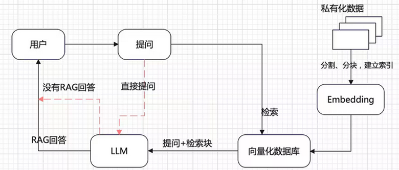 核心逻辑:通过检索外部知识库(如向量数据库)获取相关文档,将其作为上下文附加到用户查询中,辅助 LLM 生成更准确、有依据的回答。