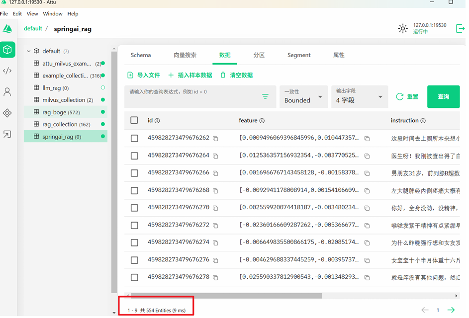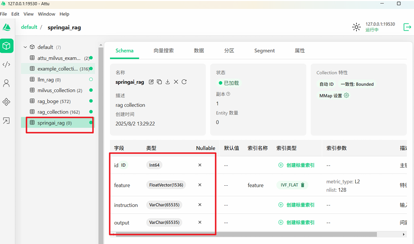 protobuf的依赖有冲突,这里排除mysql中的冲突依赖。需要把向量数据信息存储到Milvus数据库中,那么就得先创建对应的集合和索引,具体代码如下: